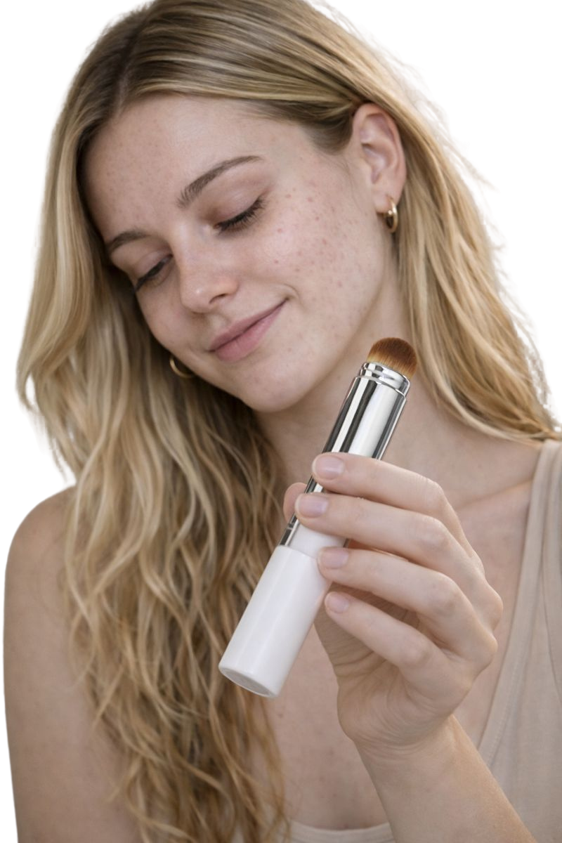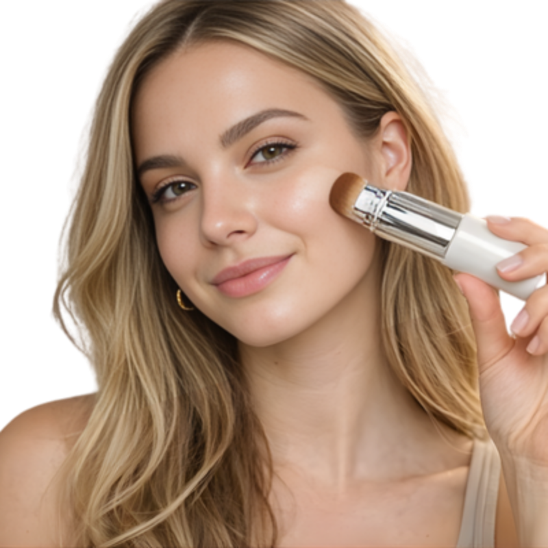 It is a 2-in-1 foundation stick with a built-in brush that automatically adapts to your skin tone, helping to even out, brighten, and cover imperfections with a natural, lightweight finish.
